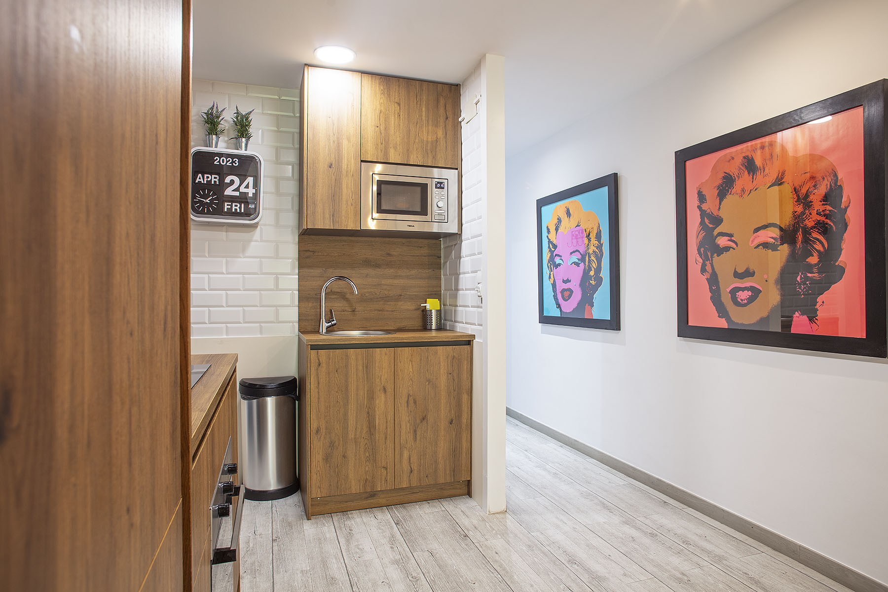 La cocina americana está completamente equipada con electrodomésticos modernos, incluyendo nevera, congelador, lavadora, horno, microondas, cafetera, tostadora, hervidor, exprimidor y menaje completo. Perfecta para preparar comidas rápidas o elaborar deliciosas recetas locales durante su estancia.